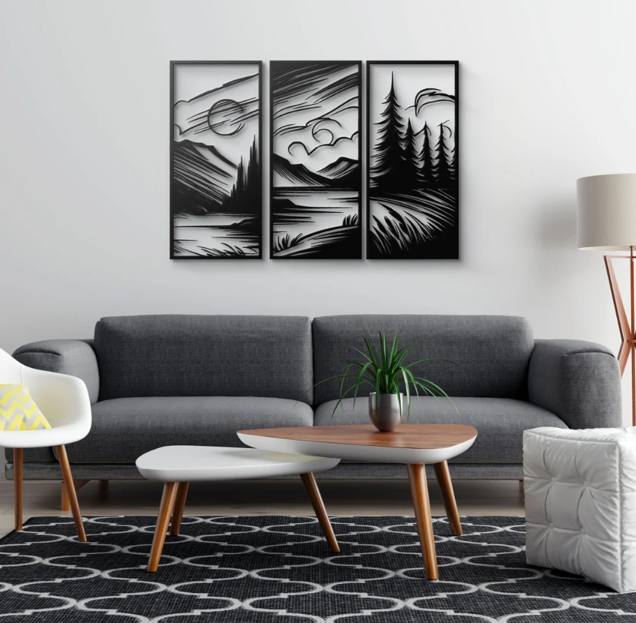 Ta dekoracja ścienna przedstawia trzy panele z krajobrazami górskimi i leśnymi, tworząc harmonijną i spójną kompozycję natury. Każdy fragment ukazuje inne oblicze przyrody — majestatyczne szczyty, spokojne jeziora i wysokie drzewa poruszane wiatrem. Dynamiczne linie i kontrast czerni z bielą nadają całości lekko abstrakcyjny, artystyczny charakter.