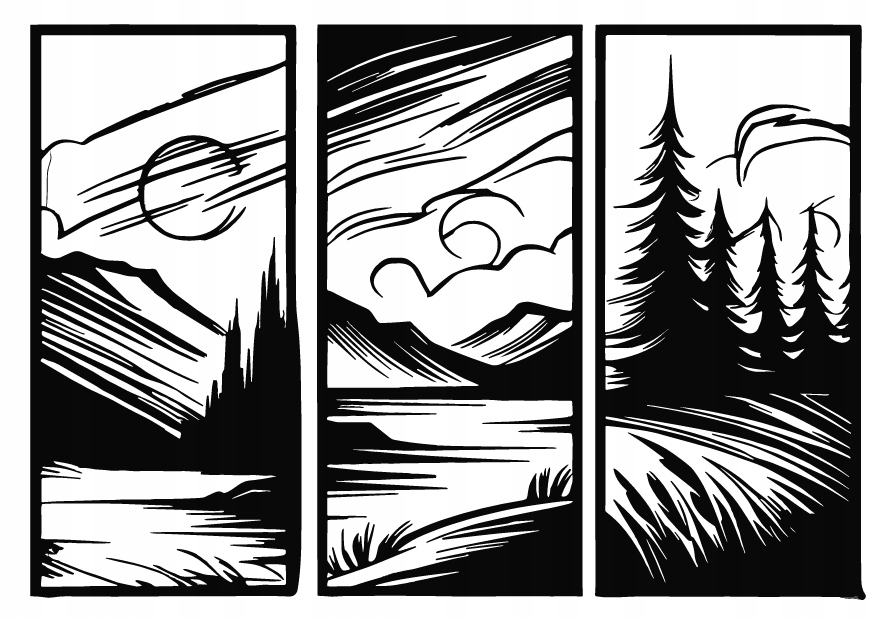 Ta dekoracja ścienna przedstawia trzy panele z krajobrazami górskimi i leśnymi, tworząc harmonijną i spójną kompozycję natury. Każdy fragment ukazuje inne oblicze przyrody — majestatyczne szczyty, spokojne jeziora i wysokie drzewa poruszane wiatrem. Dynamiczne linie i kontrast czerni z bielą nadają całości lekko abstrakcyjny, artystyczny charakter.