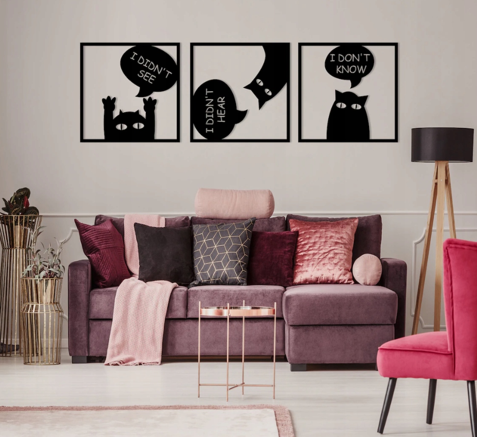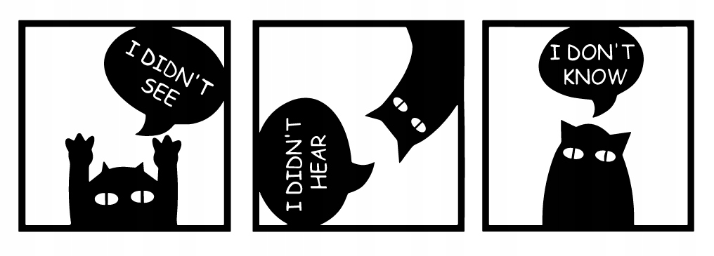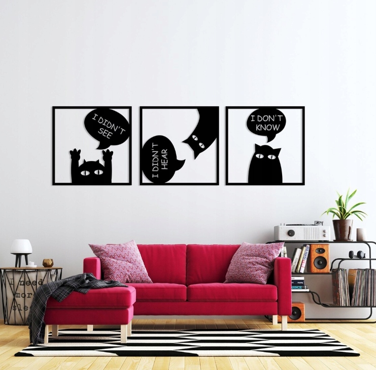 Dekoracja ścienna w zabawnym stylu, przedstawiająca trzy koty ujęte w osobnych ramkach. Każdy z nich ma przypisaną komiksową chmurkę z napisem: „I DIDN’T SEE”, „I DIDN’T HEAR” oraz „I DON’T KNOW”. Prosty, czarno-biały design nadaje całości humorystycznego charakteru, czyniąc z niej świetny element wystroju dla miłośników kotów i lekkich, żartobliwych akcentów. Idealna do kuchni, salonu czy pokoju młodzieżowego.