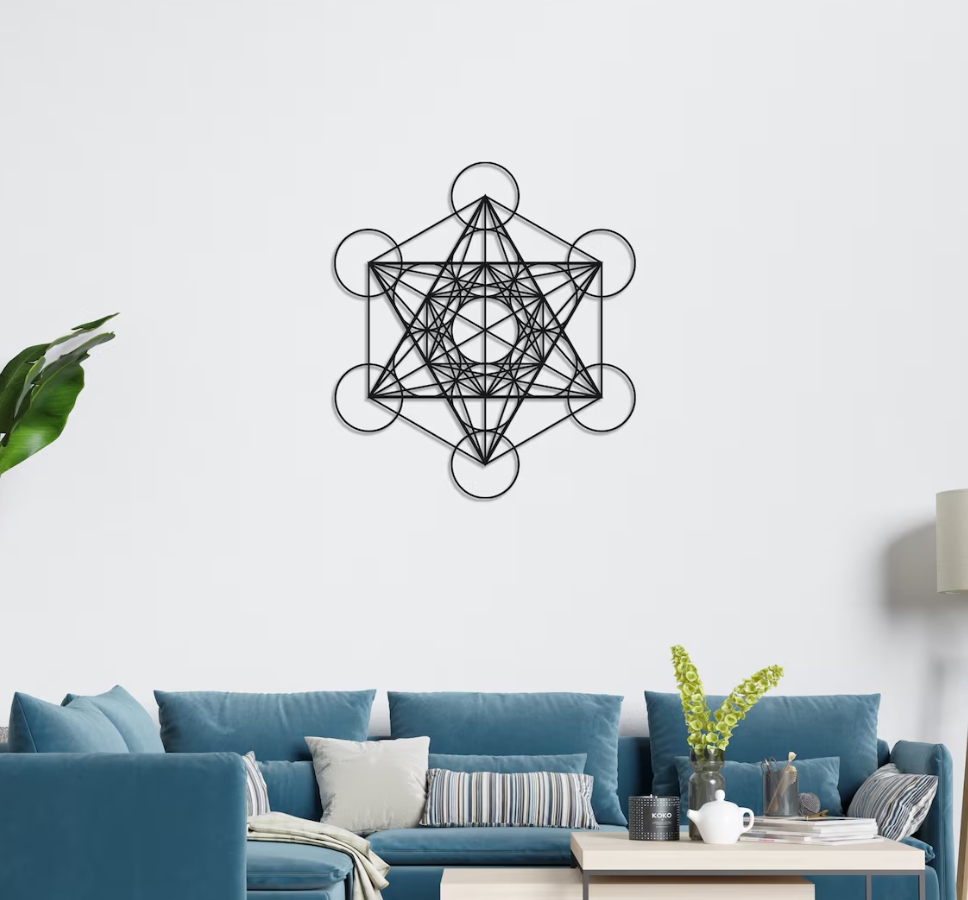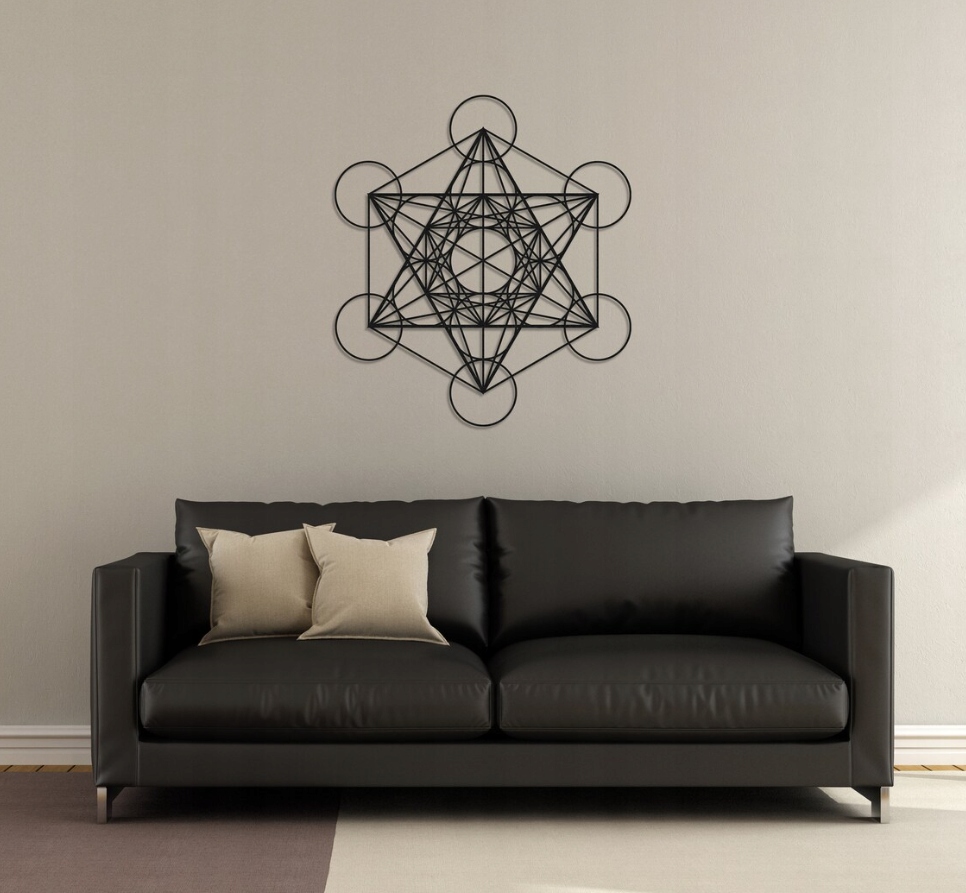 Geometryczna dekoracja w formie symetrycznej gwiazdy wpisanej w sześciokąt i otoczonej okręgami to wzór o harmonijnej i mistycznej estetyce. Precyzyjne linie i powtarzalne figury nadają jej charakter mandali, co sprawia, że świetnie sprawdzi się jako element ozdobny sprzyjający koncentracji, wyciszeniu i poczuciu równowagi. Idealna do wnętrz inspirowanych minimalizmem, nowoczesnym designem lub przestrzeni przeznaczonych do medytacji i relaksu.
