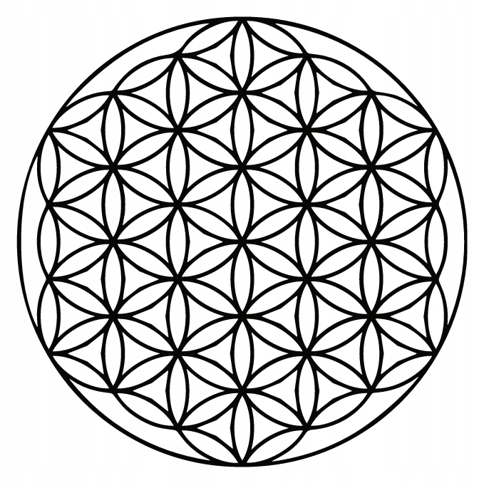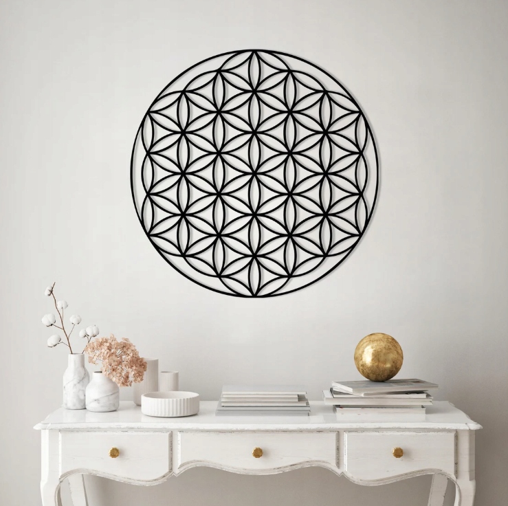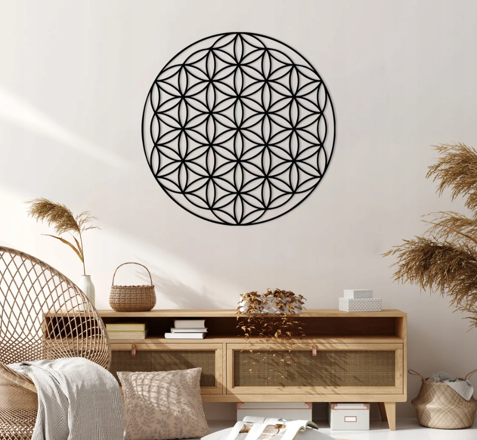 Ta dekoracja przedstawia motyw kwiatu życia, znanego symbolu geometrycznego, który składa się z regularnych, symetrycznie ułożonych okręgów tworzących harmonijny wzór. Symbol ten od wieków kojarzony jest z harmonią, równowagą i nieskończonością.