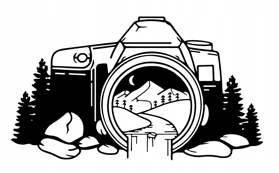 Grafika przedstawia aparat fotograficzny, którego obiektyw ukazuje górski krajobraz z rzeką, drzewami i księżycem na niebie. Całość otoczona jest kamieniami i sosnami, co podkreśla powiązanie natury z pasją fotografii. Motyw ten symbolizuje sztukę uchwycenia piękna świata w obiektywie i świetnie sprawdzi się jako dekoracja dla miłośników fotografii, podróży i przyrody.
