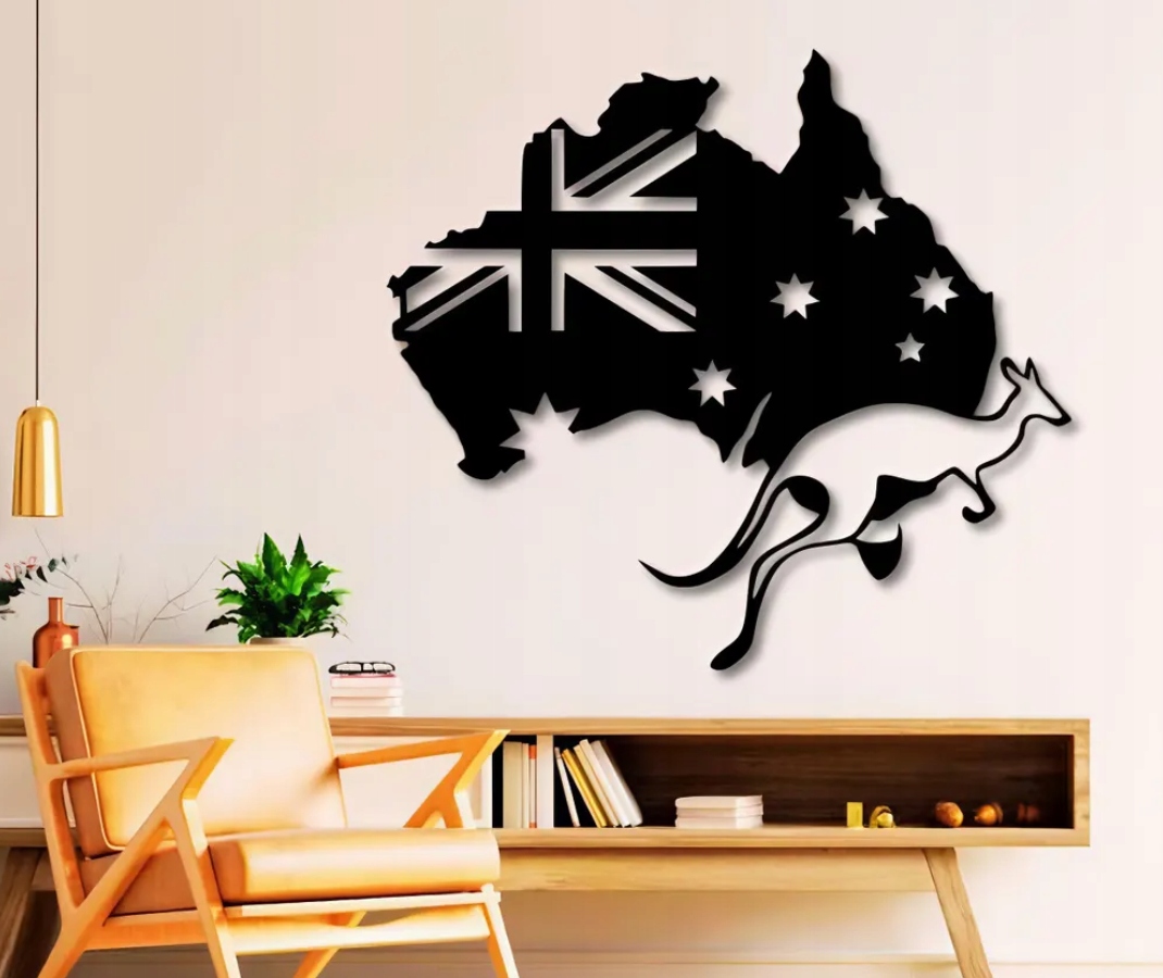 Na pierwszym planie widoczny jest kangur, będący jednym z najważniejszych symboli Australii. Połączenie mapy, flagi i zwierzęcia tworzy mocny znak graficzny, który od razu kojarzy się z tym kontynentem i jego unikalnym charakterem.