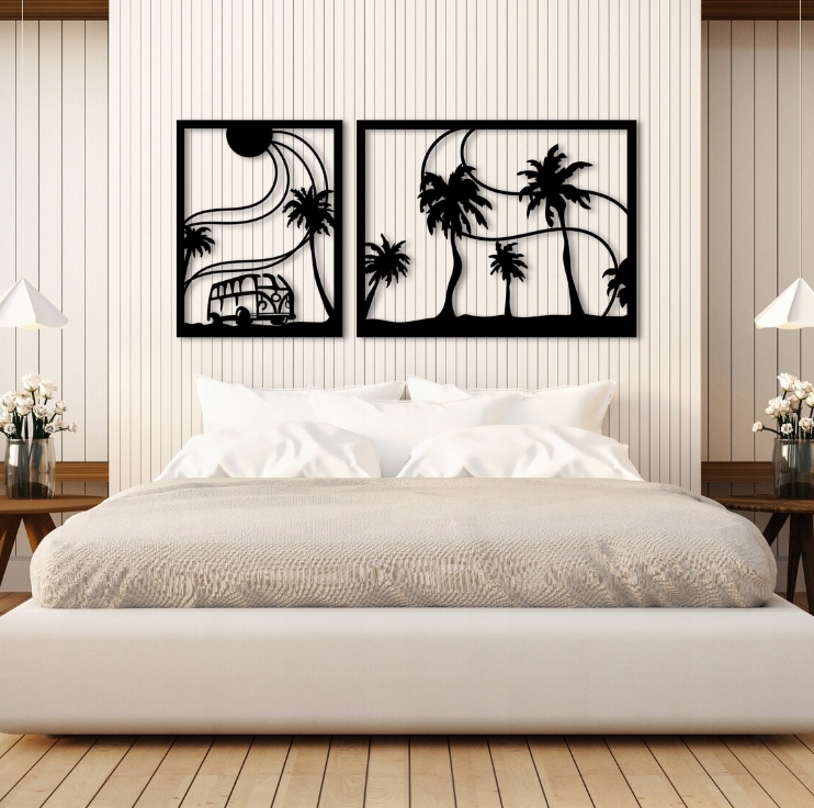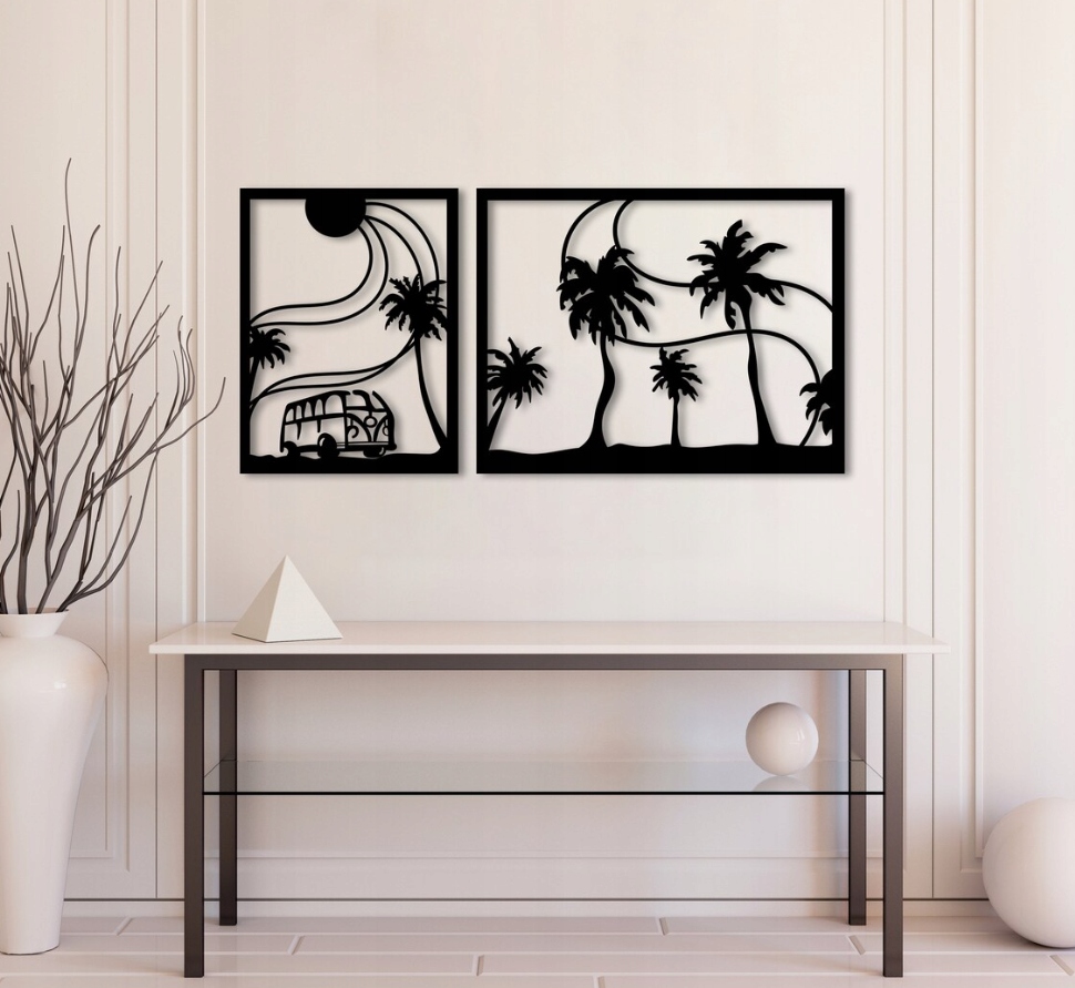 Dekoracja przedstawiająca wakacyjny klimat z palmami, słońcem i kultowym busem idealnie oddaje atmosferę podróży, swobody i relaksu. Motyw kojarzy się z beztroskimi chwilami na plaży i przygodami na szlaku, dlatego świetnie sprawdzi się jako ozdoba w salonie, pokoju młodzieżowym czy wnętrzu w stylu boho. To propozycja dla osób, które chcą wprowadzić do swojego domu powiew lata i energię wolności.