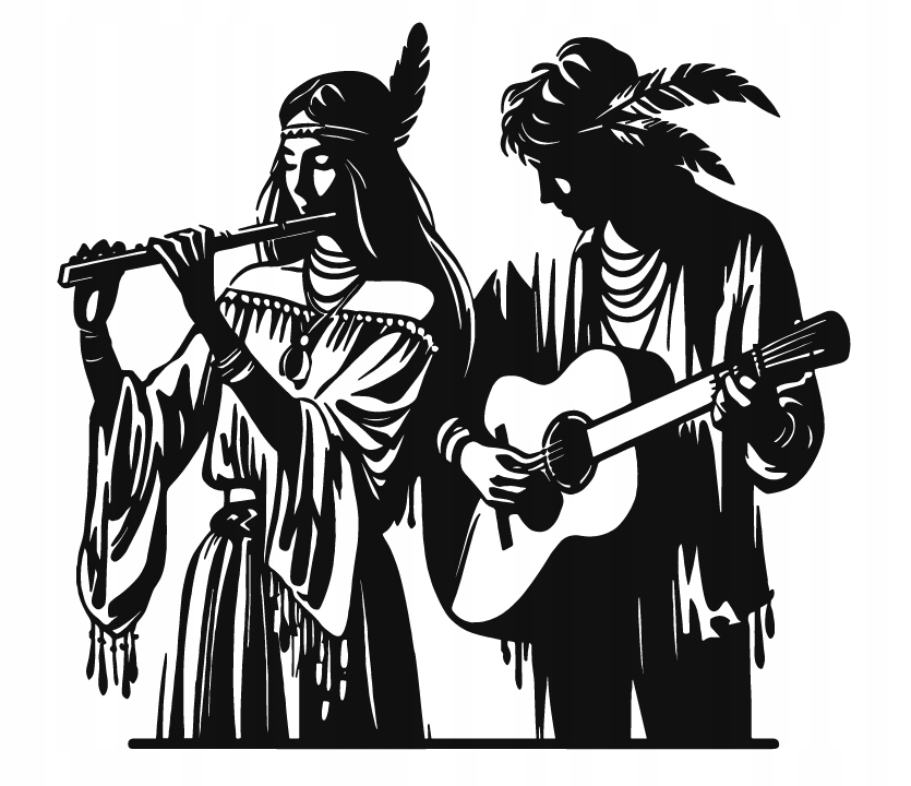 Dekoracja przedstawia parę muzyków – kobietę grającą na flecie oraz mężczyznę z gitarą. Ich stroje, ozdobione piórami i luźnymi elementami, nawiązują do stylu boho, a dynamiczne linie nadają scenie lekkości i swobody. Całość utrzymana jest w kontrastowym, artystycznym stylu, który przyciąga uwagę.