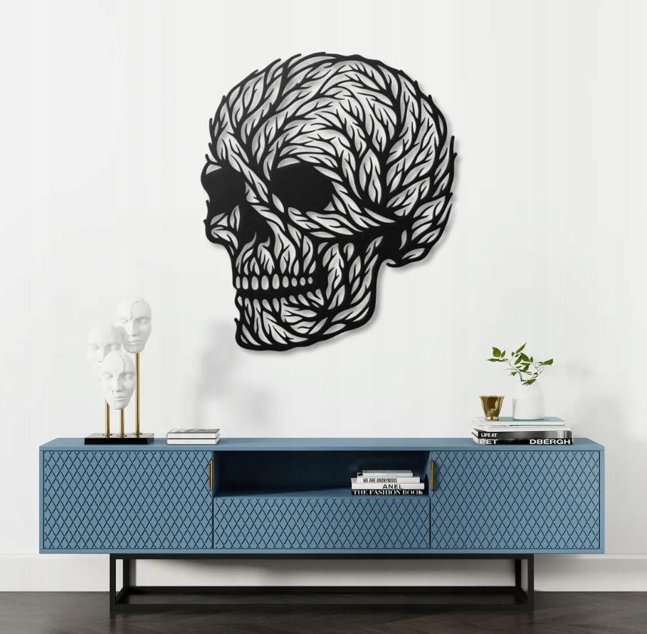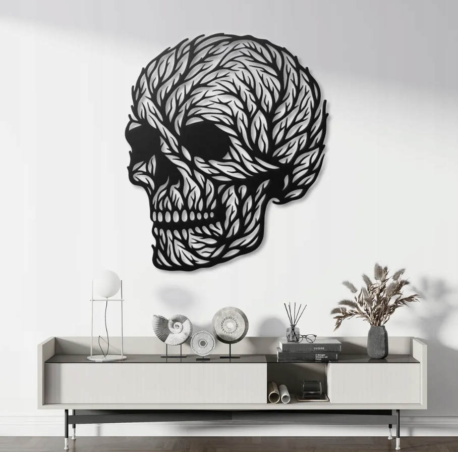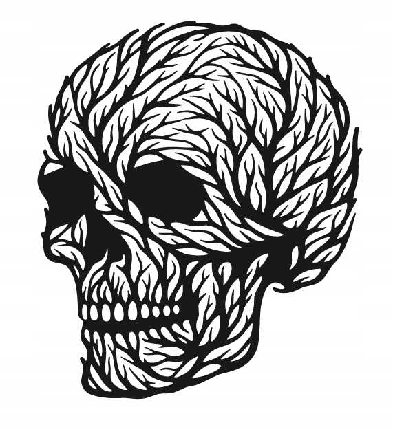 Dekoracja przedstawia czaszkę, której powierzchnię tworzą splątane, organiczne linie przypominające liście lub gałęzie. Motyw ten łączy w sobie symbolikę życia i śmierci — natura oplatająca czaszkę może oznaczać odradzanie się, cykl przemijania oraz nierozerwalny związek człowieka z przyrodą. Kontrast czerni i bieli nadaje całości głębi oraz hipnotyzującego charakteru.
