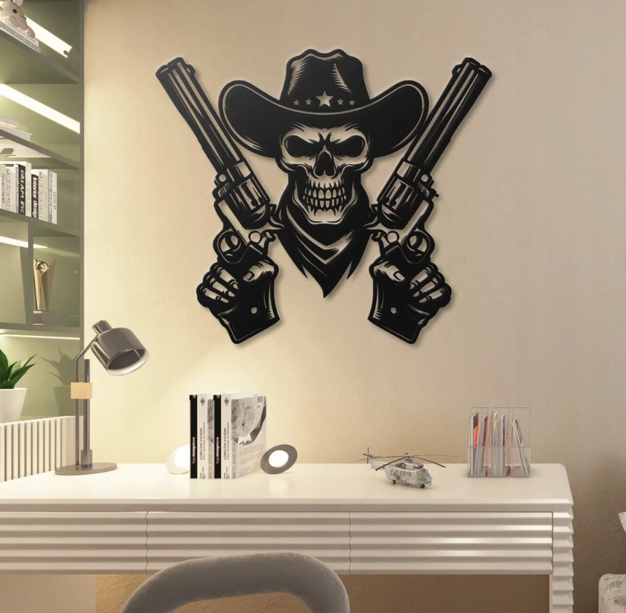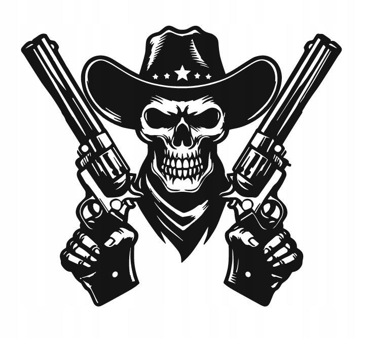 Ta dekoracja przedstawia czaszkę kowboja z dwoma rewolwerami uniesionymi po bokach — symbol odwagi, buntu i wolności. Motyw utrzymany jest w stylistyce Dzikiego Zachodu, z mocnymi kontrastami i ostrymi liniami, które nadają całości wyrazistości i energii.