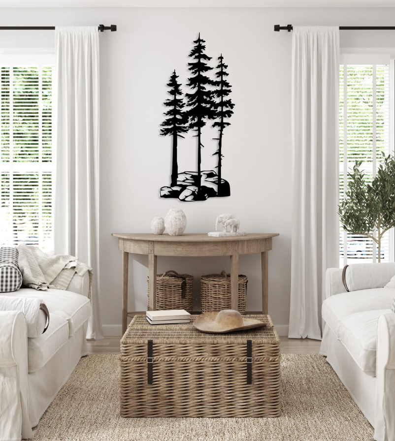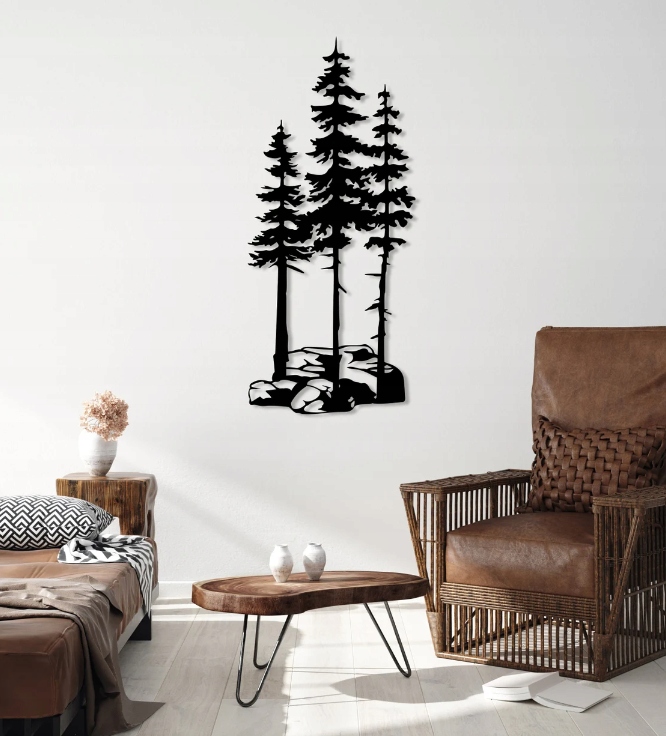 Dekoracja przedstawia wysokie, smukłe drzewa rosnące na skalistym podłożu, tworzące naturalny i harmonijny motyw inspirowany górskim krajobrazem. Czarne kontury drzew kontrastują z jasnym tłem, dzięki czemu kompozycja zyskuje głębię i wyrazistość. Całość zachwyca prostotą formy i subtelnym realizmem, który oddaje spokój oraz potęgę natury.Motyw drzew symbolizuje siłę, trwałość i bliskość z przyrodą, dlatego dekoracja doskonale sprawdzi się w aranżacjach inspirowanych naturą, stylem skandynawskim czy rustykalnym. Wnosi do wnętrza wrażenie świeżości i równowagi, a jednocześnie stanowi elegancki element ozdobny, który może być centralnym punktem dekoracyjnym przestrzeni.
