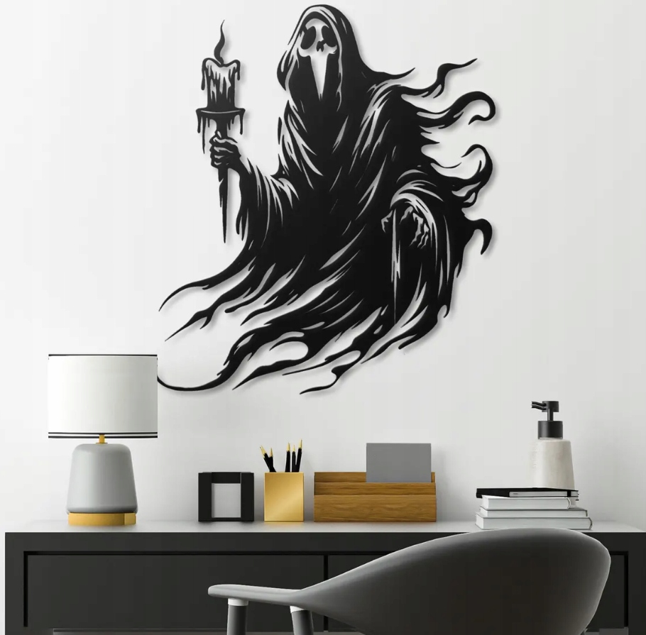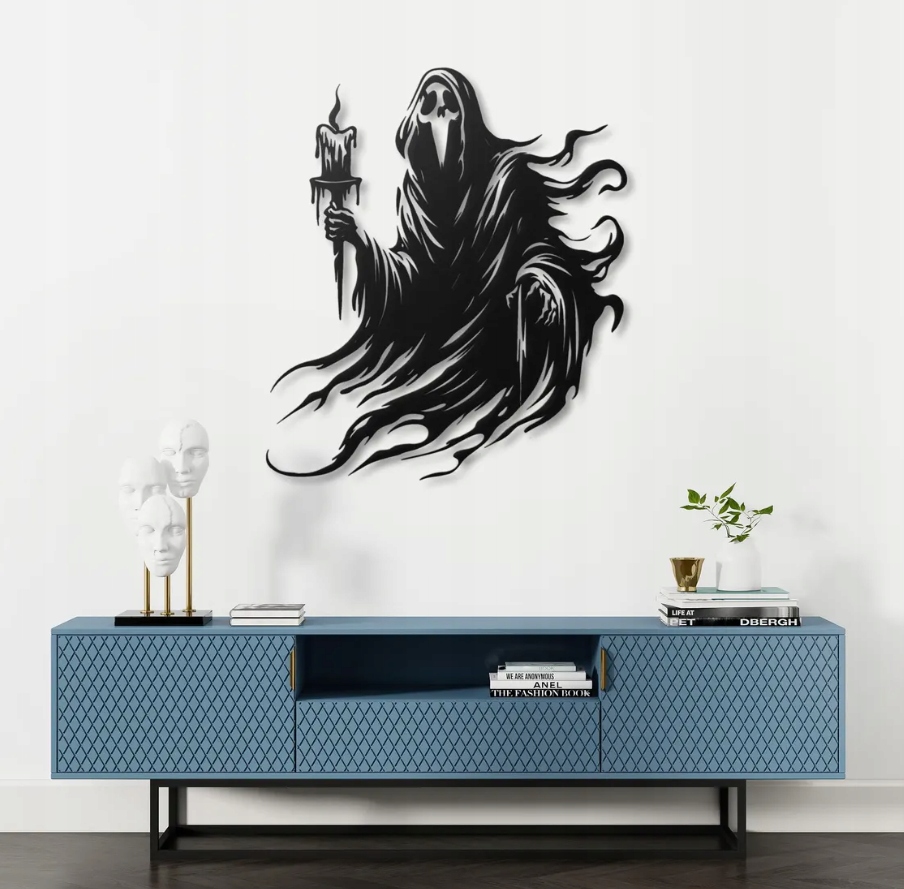 Motyw symbolizuje nieznane, przemijanie i tajemnicę świata duchów. To dekoracja, która wprowadzi do wnętrza klimat grozy i magii, idealna dla miłośników mrocznej estetyki i gotyckiej symboliki. Doskonale sprawdzi się w nowoczesnych, industrialnych aranżacjach, nadając im niepowtarzalny, artystyczny charakter z nutą tajemnicy i teatralnego dramatyzmu.