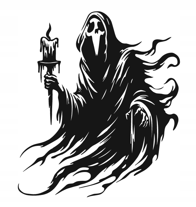 Dekoracja przedstawia tajemniczą postać odzianą w długą, falującą szatę, trzymającą w dłoni świecę z kapiącym woskiem. Płynne, ostre linie tworzą efekt ruchu i lekkiego unoszenia się sylwetki, nadając całości wrażenie, jakby postać wyłaniała się z cienia lub mgły. Kontrastowe czernie i biele potęgują nastrój tajemniczości i mroku.