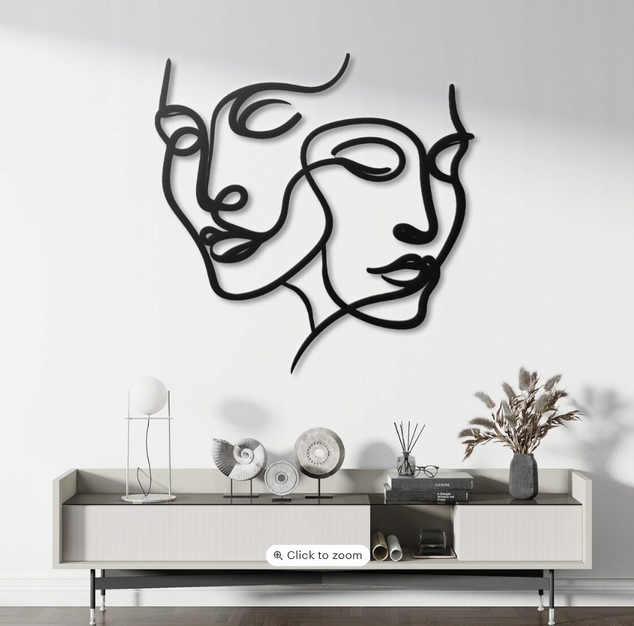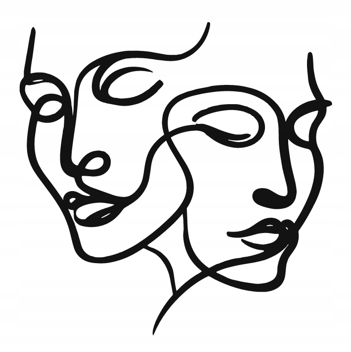 Dekoracja przedstawia dwa nachodzące na siebie kontury twarzy, stworzone jedną, płynną linią w minimalistycznym stylu. Delikatne rysy oczu, nosa i ust nadają całości elegancję oraz nowoczesny, abstrakcyjny charakter, idealnie wpisujący się w estetykę sztuki współczesnej.