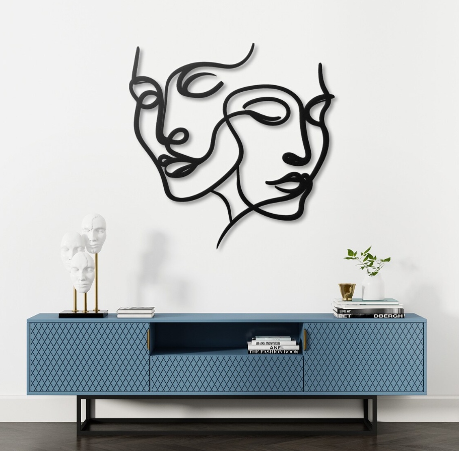 Dekoracja przedstawia dwa nachodzące na siebie kontury twarzy, stworzone jedną, płynną linią w minimalistycznym stylu. Delikatne rysy oczu, nosa i ust nadają całości elegancję oraz nowoczesny, abstrakcyjny charakter, idealnie wpisujący się w estetykę sztuki współczesnej.