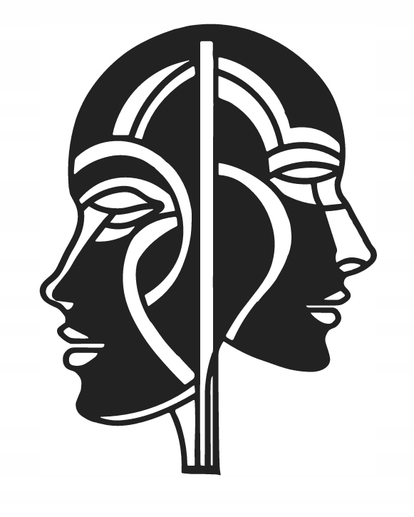 Grafika przedstawia dwie stylizowane twarze zwrócone w przeciwnych kierunkach, połączone wspólną linią biegnącą przez środek kompozycji. Użycie prostych, płynnych kształtów i kontrastu czerni oraz bieli nadaje obrazowi nowoczesny, symboliczny charakter.