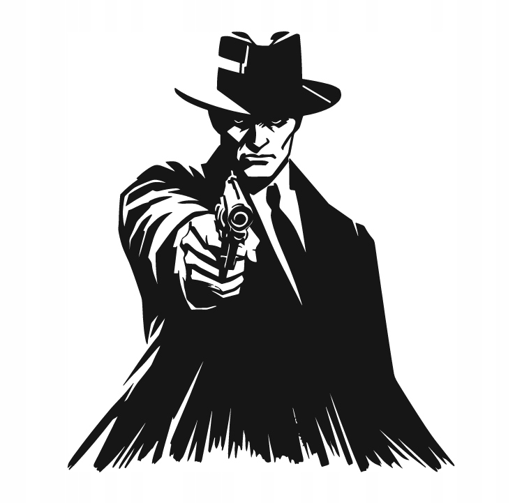 Dekoracja przedstawia mężczyznę w eleganckim płaszczu i kapeluszu, trzymającego pistolet wymierzony w stronę obserwatora. Postać emanuje chłodną pewnością siebie i zdecydowaniem, przypominając klasyczne sylwetki z filmów noir czy opowieści o gangsterach. Mocne kontrasty czerni i bieli podkreślają dramatyzm sceny, a surowe rysy twarzy nadają jej aurę tajemniczości.