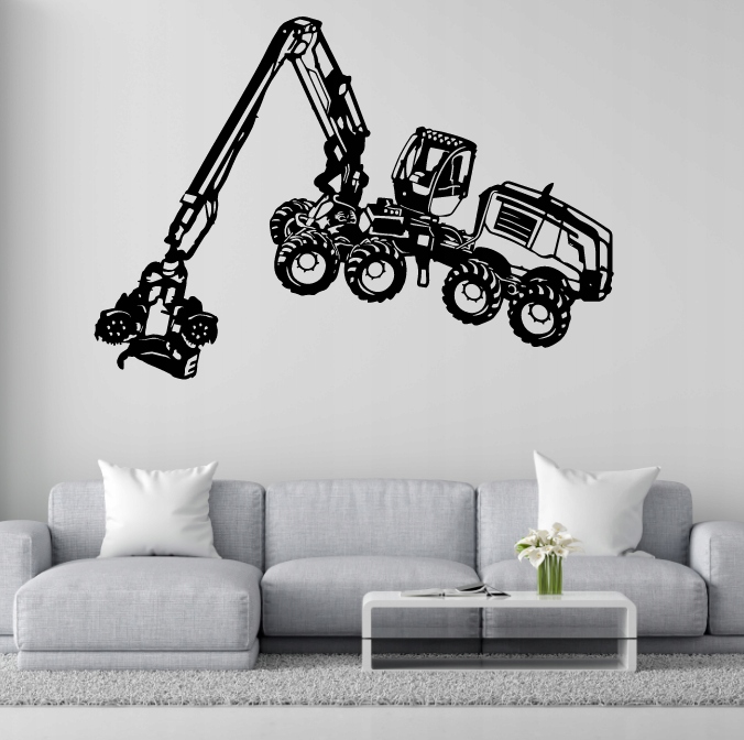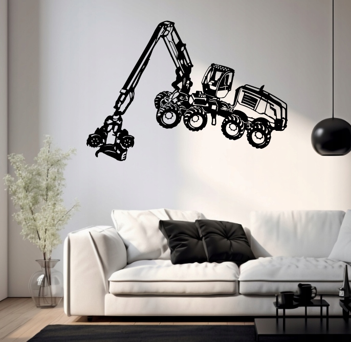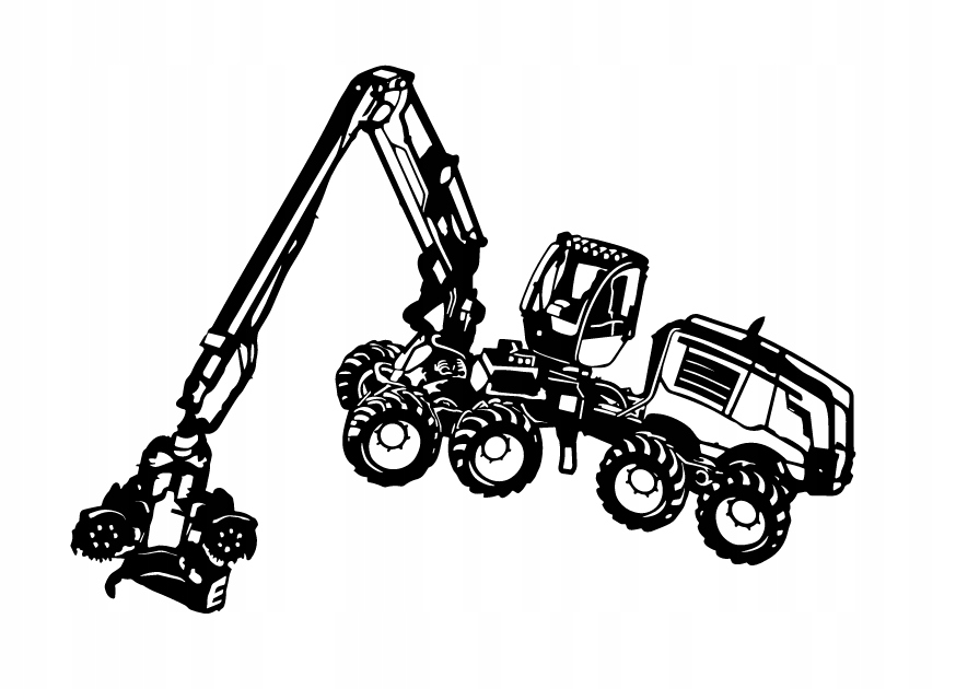Najbardziej charakterystycznym elementem jest długa, ruchoma wysięgnica zakończona specjalnym chwytakiem i głowicą tnącą. To właśnie ona umożliwia chwytanie, cięcie oraz okrzesywanie drzew. Sylwetka maszyny oddaje jej funkcjonalność i siłę, a kontrastowe linie podkreślają techniczny i nowoczesny charakter sprzętu.