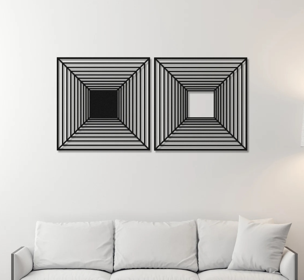 Nowoczesna dekoracja ścienna oparta na geometrycznej iluzji optycznej. Dwa wzory tworzą efekt głębi i perspektywy, przyciągając wzrok i nadając wnętrzu dynamiczny charakter. Minimalistyczne, czarno-białe linie sprawdzą się idealnie w aranżacjach w stylu industrialnym, loftowym czy nowoczesnym, dodając przestrzeni unikalnego, artystycznego wyrazu.