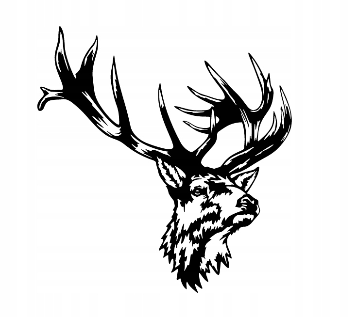 Na grafice znajduje się jeleń z potężnym, rozłożystym porożem, przedstawiony w dostojnej pozie. Głowa zwierzęcia uniesiona jest lekko ku górze, co nadaje mu majestatyczny i czujny charakter. Linie rysunku podkreślają futro na szyi oraz kontrast między jasnymi i ciemnymi partiami sylwetki.