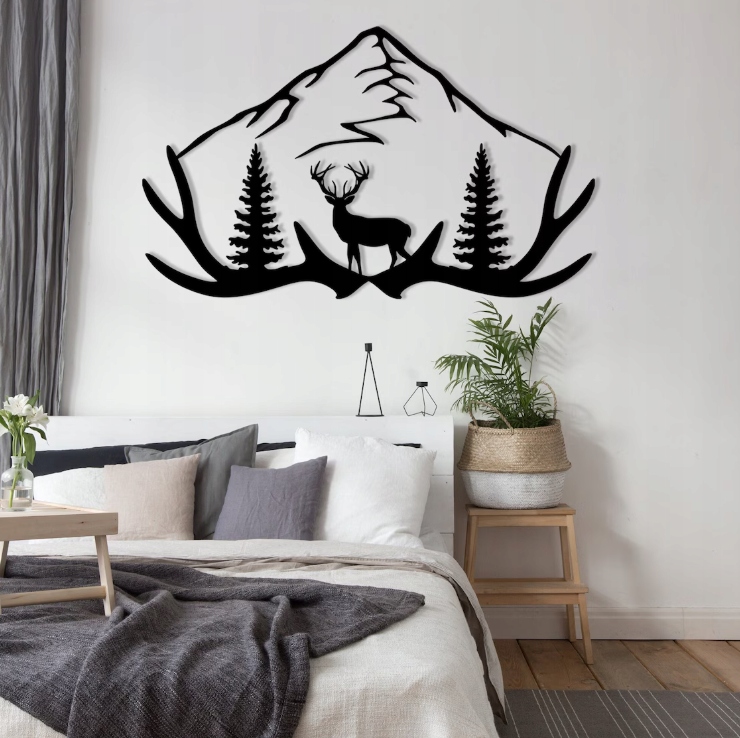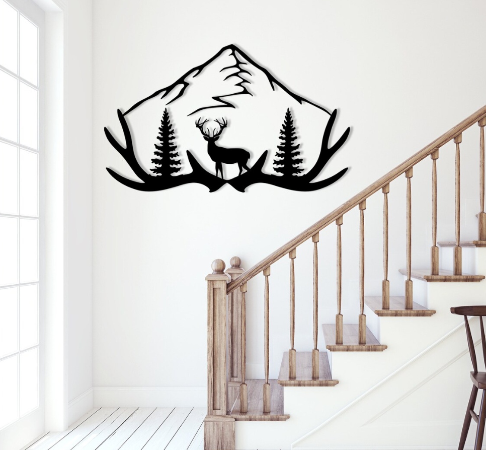 Dekoracja z jeleniem na tle gór i lasu, otoczona motywem poroża, to piękny symbol natury, wolności i siły. Idealnie oddaje klimat górskich wędrówek oraz dzikiej przyrody, dzięki czemu sprawdzi się jako ozdoba w domku letniskowym, salonie w stylu rustykalnym czy myśliwskim. To propozycja, która wprowadza do wnętrza spokój, harmonię i majestatyczny charakter natury.
