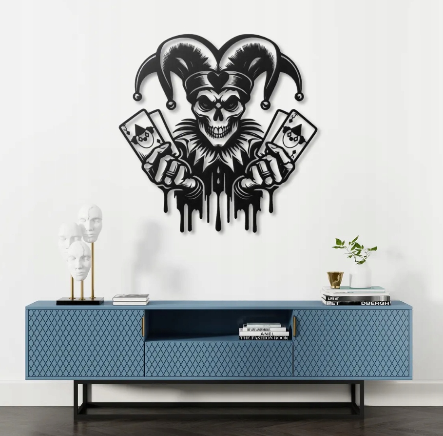 Ta dekoracja przedstawia mrocznego błazna trzymającego karty z symbolem jokera — motyw pełen tajemniczości, buntu i nieprzewidywalności. Połączenie humoru i grozy tworzy wyjątkowy, nieco prowokujący klimat, który przyciąga uwagę i intryguje swoją symboliką. Detaliczne wykonanie i kontrastowe czarno-białe linie nadają całości dynamiczny, graficzny charakter.