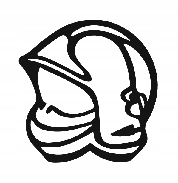 Na obrazku widoczny jest hełm strażacki w formie prostej, czarno-białej grafiki. Jego charakterystyczny kształt z wyraźnym daszkiem oraz ochronną osłoną wskazuje na przeznaczenie do pracy w ekstremalnych warunkach. Linia rysunku jest gruba i wyrazista, co sprawia, że symbol wygląda solidnie i jednoznacznie.