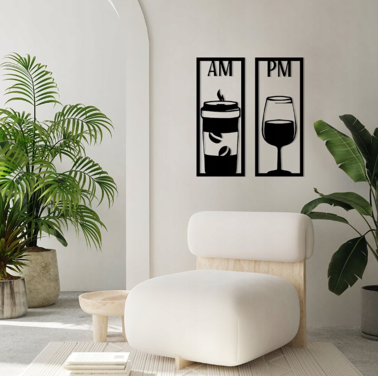 Dekoracja przedstawia napis AM z kubkiem kawy i PM z kieliszkiem wina. To humorystyczne połączenie codziennych rytuałów, które symbolizuje energię poranka i relaks wieczoru. Idealnie sprawdzi się w kuchni, jadalni lub salonie, wprowadzając do wnętrza lekkość i pozytywną atmosferę. Świetny pomysł na prezent dla miłośników kawy i wina oraz oryginalny element wystroju, który pasuje zarówno do nowoczesnych, jak i klasycznych aranżacji.