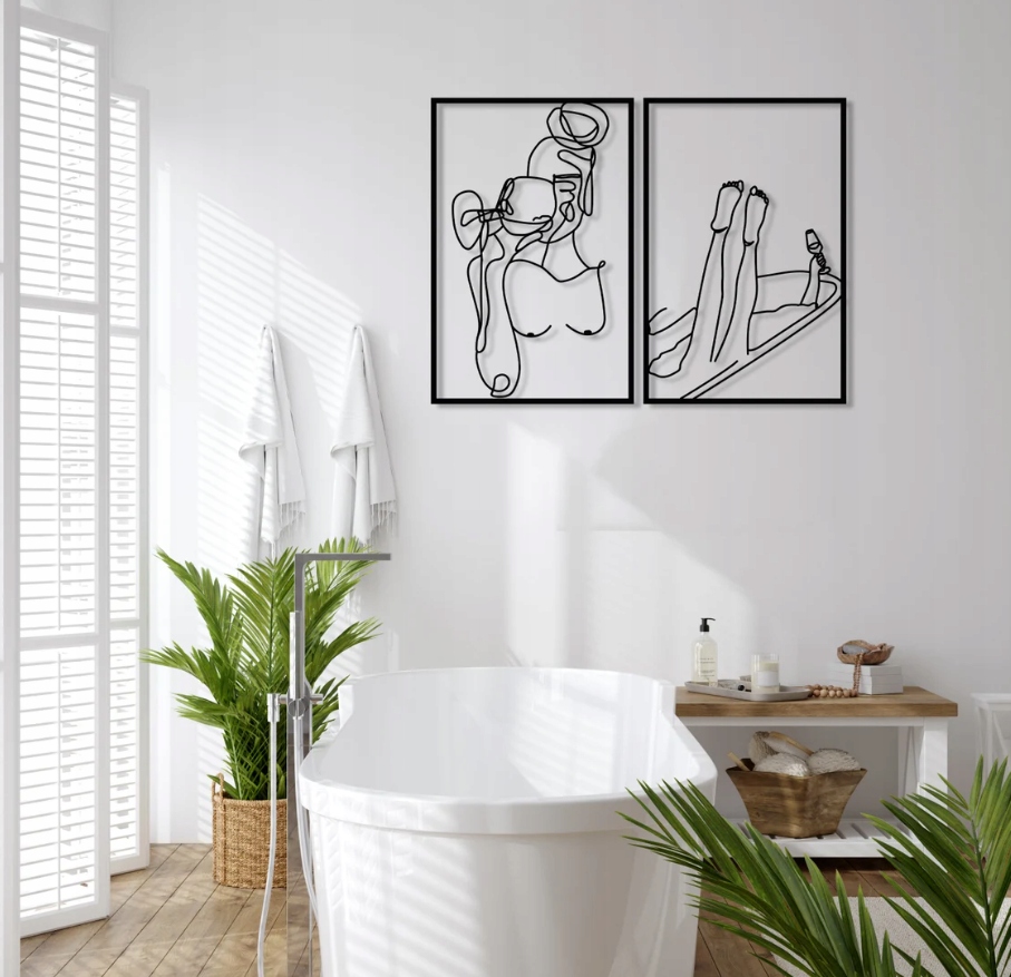 Pierwszy panel ukazuje kobiecą sylwetkę z kieliszkiem wina, naszkicowaną jednym, płynnym pociągnięciem linii, co symbolizuje lekkość, kobiecość i zmysłowość. Drugi panel przedstawia nogi kobiety zanurzonej w wannie, trzymającej kieliszek, co budzi skojarzenia z relaksem i chwilą odpoczynku. Obie grafiki razem tworzą harmonijną całość – doskonałą dekorację do sypialni, łazienki czy salonu, wprowadzającą atmosferę spokoju, elegancji i intymności.