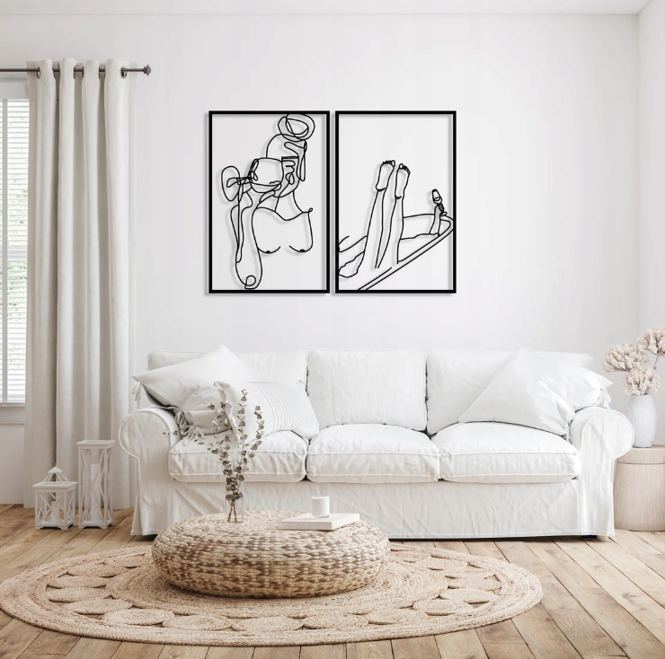 Obraz przedstawia dwie minimalistyczne grafiki wykonane w stylu line art, które idealnie wpisują się w nowoczesne, subtelne dekoracje wnętrz. Obie kompozycje są utrzymane w czarno-białej kolorystyce, co dodaje im elegancji i pozwala na dopasowanie do różnych aranżacji – od minimalistycznych po bardziej artystyczne.