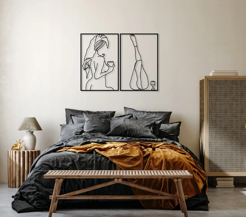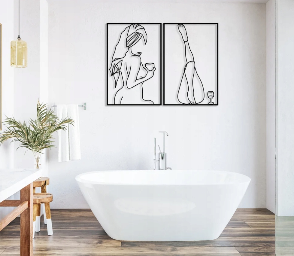 Subtelna, minimalistyczna dekoracja w formie dwóch linearnych grafik, które ukazują kobiecą sylwetkę w momentach relaksu. Delikatne linie tworzą lekką, zmysłową kompozycję, zachowując przy tym elegancję i umiar. Oba motywy emanują spokojem oraz intymną atmosferą domowego odpoczynku, wprowadzając do przestrzeni poczucie harmonii i odprężenia.