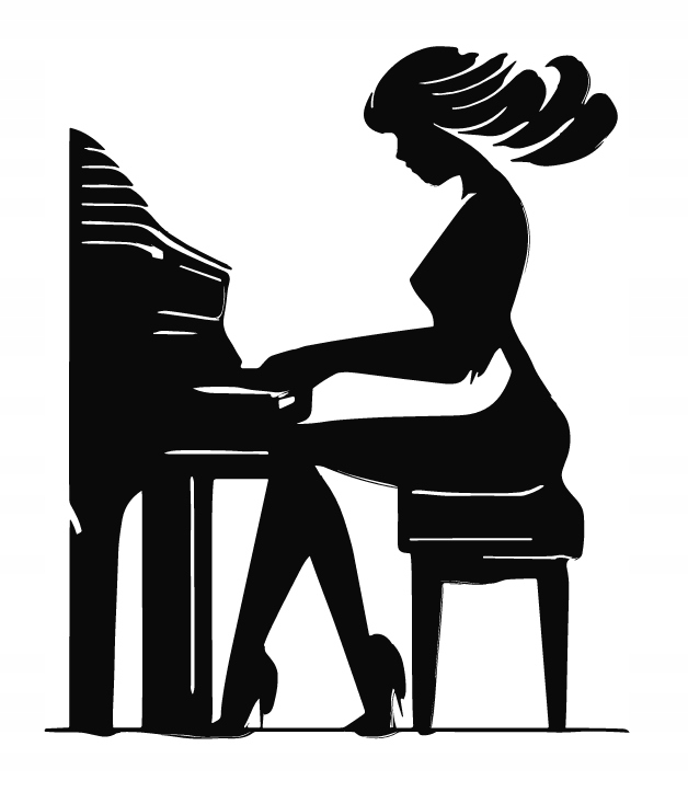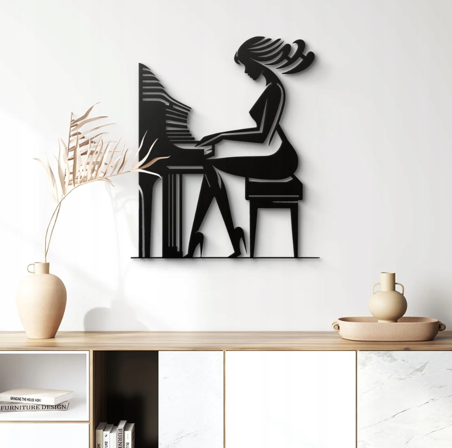 Dekoracja przedstawia kobietę grającą na fortepianie, ujętą w eleganckiej, dynamicznej pozie. Subtelne linie podkreślają kobiecą sylwetkę i ruch włosów, a kontrastowe zestawienie czerni i bieli nadaje kompozycji nowoczesny i artystyczny charakter.