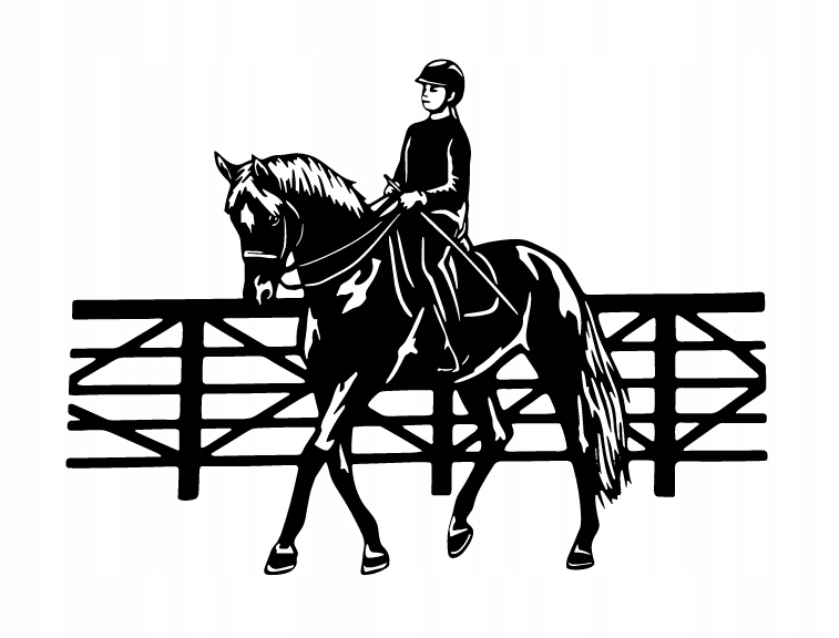 W tle znajduje się ogrodzenie, co wskazuje, że akcja rozgrywa się na wybiegu lub w zagrodzie przeznaczonej do jazdy konnej. Prosta, kontrastowa forma obrazu podkreśla dynamikę ruchu konia, a jednocześnie zachowuje dekoracyjny charakter całości.