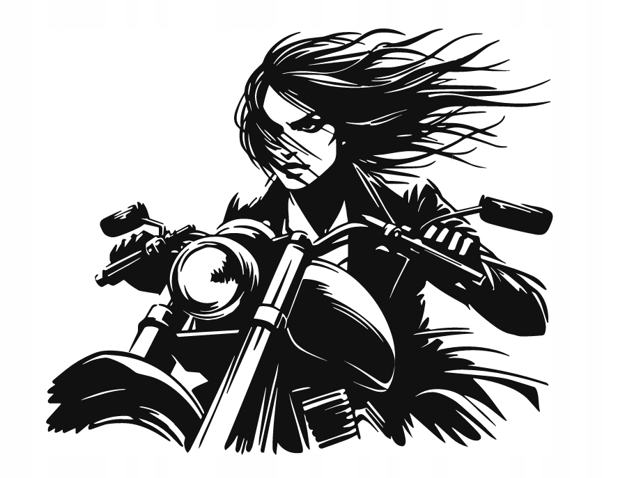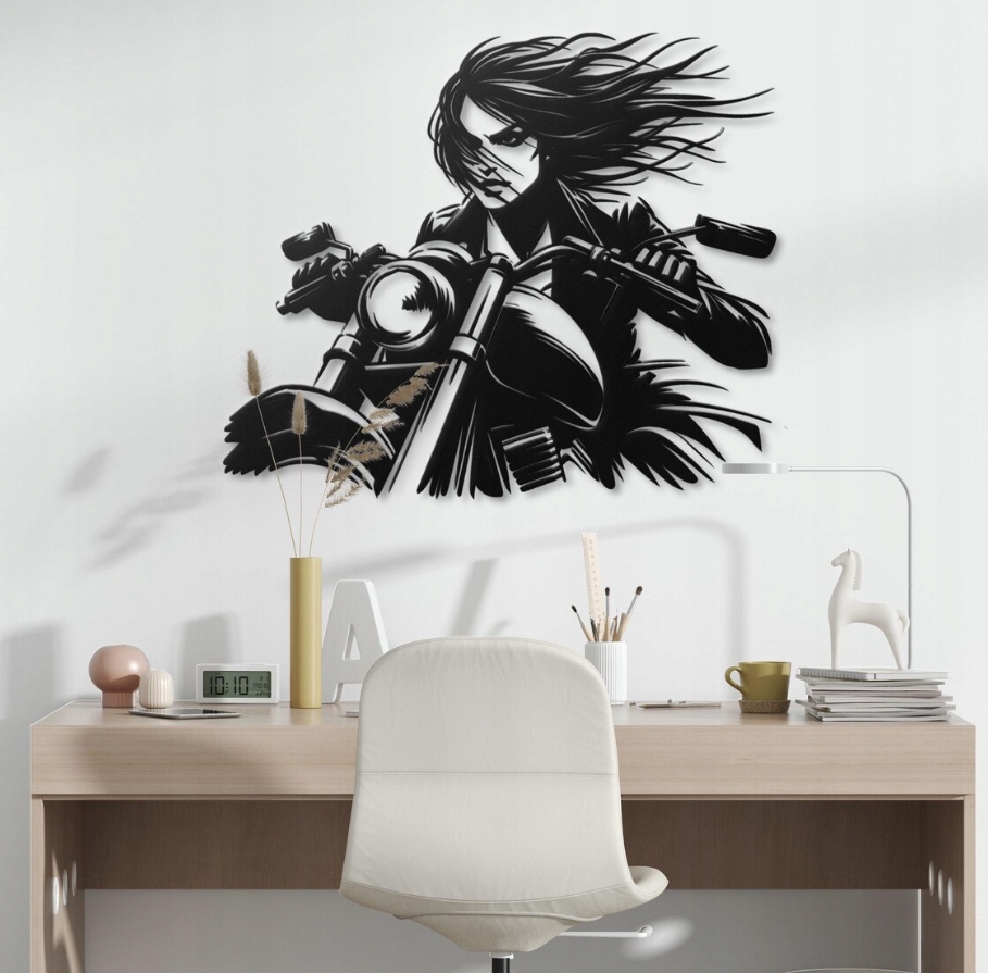 Dekoracja przedstawia kobietę pędzącą na motocyklu, ujętą w dynamicznej pozie z rozwianymi włosami. Mocne kontrasty i zdecydowane linie nadają całości energii oraz wyrazistości, tworząc obraz pełen siły i niezależności.