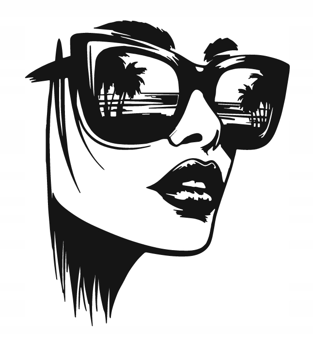 Dekoracja przedstawia stylizowaną twarz kobiety w dużych, nowoczesnych okularach przeciwsłonecznych, w których odbija się krajobraz z palmami i linią horyzontu. Kontrastowe, czarne linie nadają całości wyrazistości i artystycznego charakteru, podkreślając elegancję oraz odważny, współczesny styl.