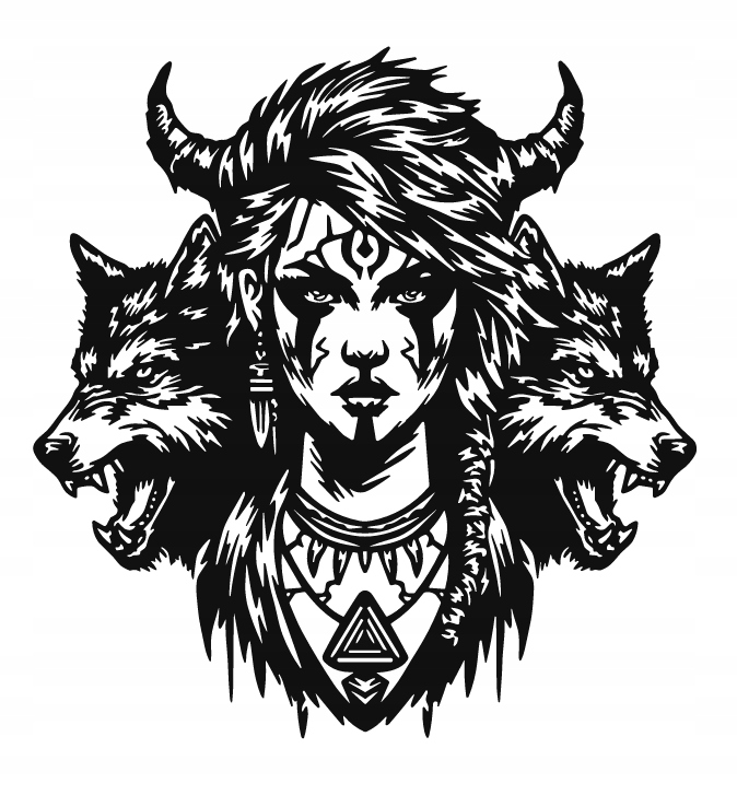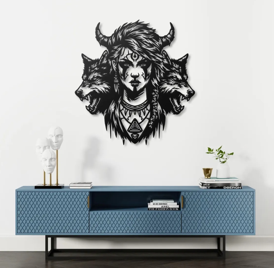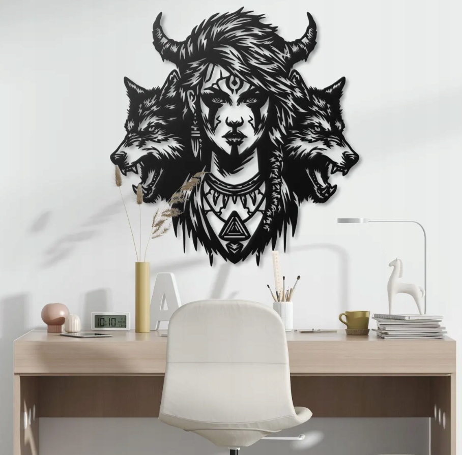 Ta wyjątkowa dekoracja przedstawia mistyczną postać kobiety otoczonej przez dwa wilki, symbolizujące lojalność, siłę i instynkt. Rogi, plemienne ozdoby i magiczne symbole nadają jej charakter szamanki lub strażniczki natury, co wprowadza do wnętrza tajemniczy i duchowy klimat. Detale są pełne ekspresji i mocy, a całość emanuje energią dzikiej wolności i połączenia z naturą.