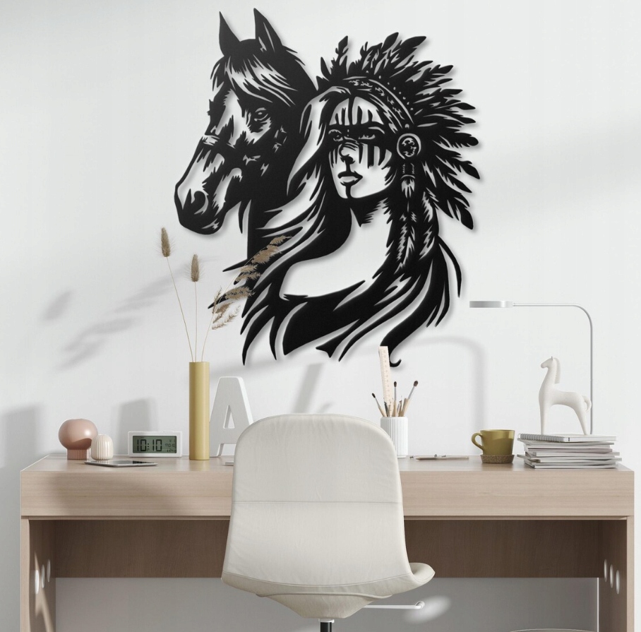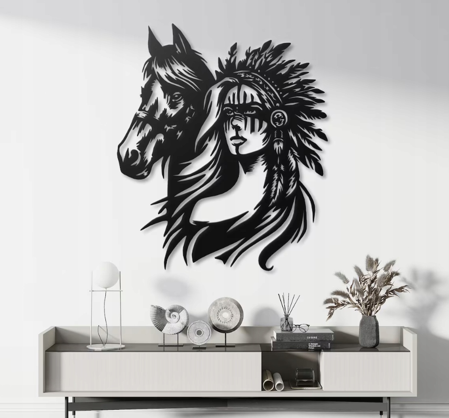 Dekoracja ścienna przedstawia kobietę w pióropuszu oraz konia, wykonana w efektownym, czarno-białym stylu graficznym o wyrazistych kontrastach i płynnych liniach. Kompozycja łączy w sobie siłę, spokój i duchową więź człowieka z naturą, tworząc obraz pełen harmonii i symboliki. Kobieta emanuje pewnością siebie i dostojeństwem, a koń symbolizuje wolność, odwagę i lojalność.