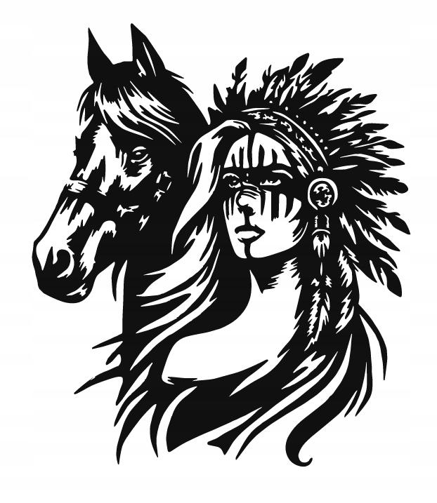 Dekoracja ścienna przedstawia kobietę w pióropuszu oraz konia, wykonana w efektownym, czarno-białym stylu graficznym o wyrazistych kontrastach i płynnych liniach. Kompozycja łączy w sobie siłę, spokój i duchową więź człowieka z naturą, tworząc obraz pełen harmonii i symboliki. Kobieta emanuje pewnością siebie i dostojeństwem, a koń symbolizuje wolność, odwagę i lojalność.