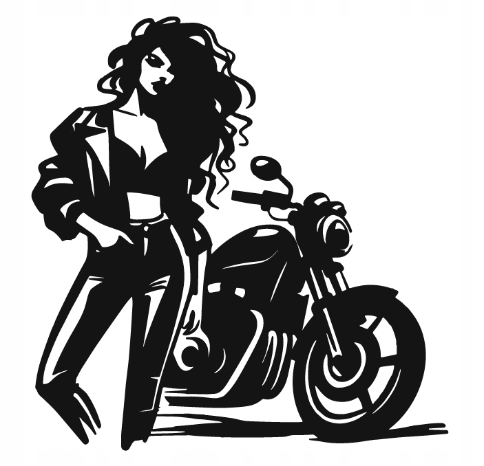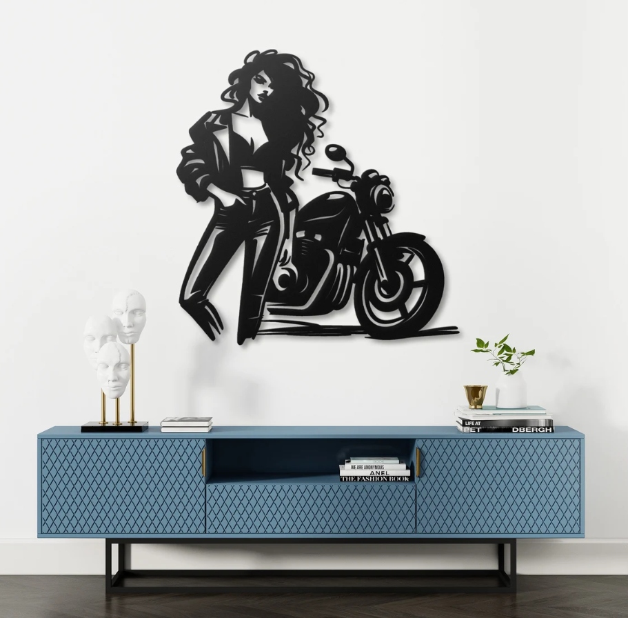 Ta dekoracja ścienna emanuje pewnością siebie i energią. Postać kobiety w skórzanej kurtce, stojącej obok motocykla, symbolizuje niezależność, odwagę i wolność. Dynamiczne linie oraz kontrast czerni i bieli nadają całości wyrazistości i charakteru, tworząc kompozycję o nowoczesnym, buntowniczym stylu.