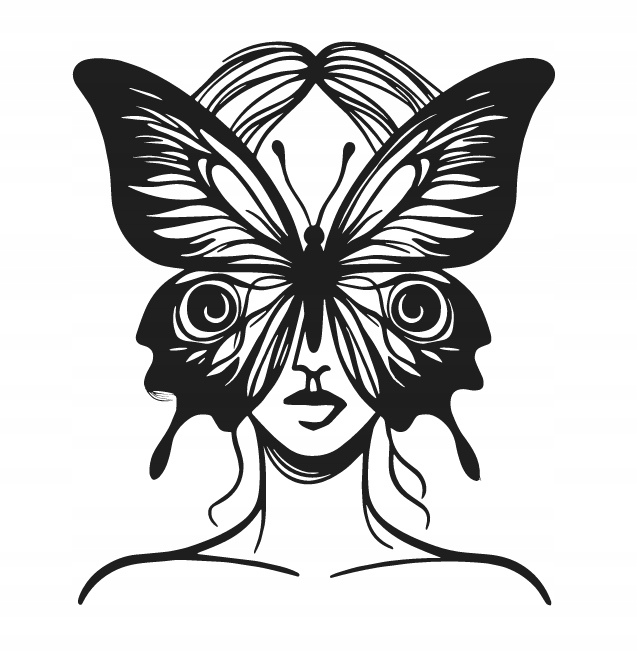 Dekoracja przedstawia postać kobiety, której twarz płynnie łączy się ze skrzydłami motyla, tworząc niezwykłą, surrealistyczną kompozycję. Delikatne linie i symetryczna forma nadają całości wrażenie harmonii i spokoju, a kontrast czerni i bieli podkreśla subtelność oraz elegancję motywu. Połączenie ludzkich rysów z motylim kształtem symbolizuje przemianę, lekkość i duchową wolność.