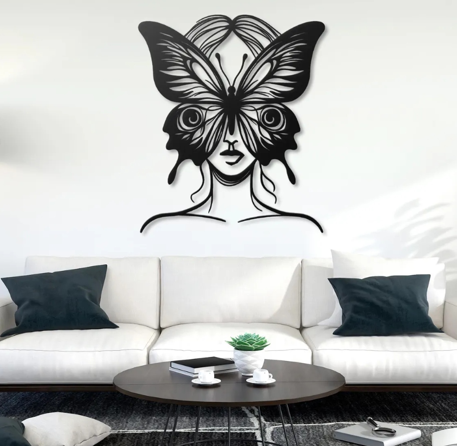 Dekoracja przedstawia postać kobiety, której twarz płynnie łączy się ze skrzydłami motyla, tworząc niezwykłą, surrealistyczną kompozycję. Delikatne linie i symetryczna forma nadają całości wrażenie harmonii i spokoju, a kontrast czerni i bieli podkreśla subtelność oraz elegancję motywu. Połączenie ludzkich rysów z motylim kształtem symbolizuje przemianę, lekkość i duchową wolność.