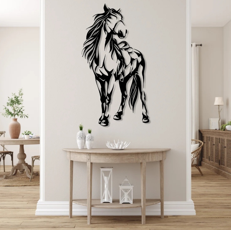 Motyw ten doskonale sprawdzi się jako ozdoba wnętrza inspirowanego naturą lub w przestrzeniach, gdzie liczy się symbolika wolności i niezależności. Stylizowany rysunek konia wprowadza do aranżacji poczucie lekkości, a jednocześnie siły, nadając pomieszczeniu wyjątkowy charakter i subtelny akcent artystyczny.