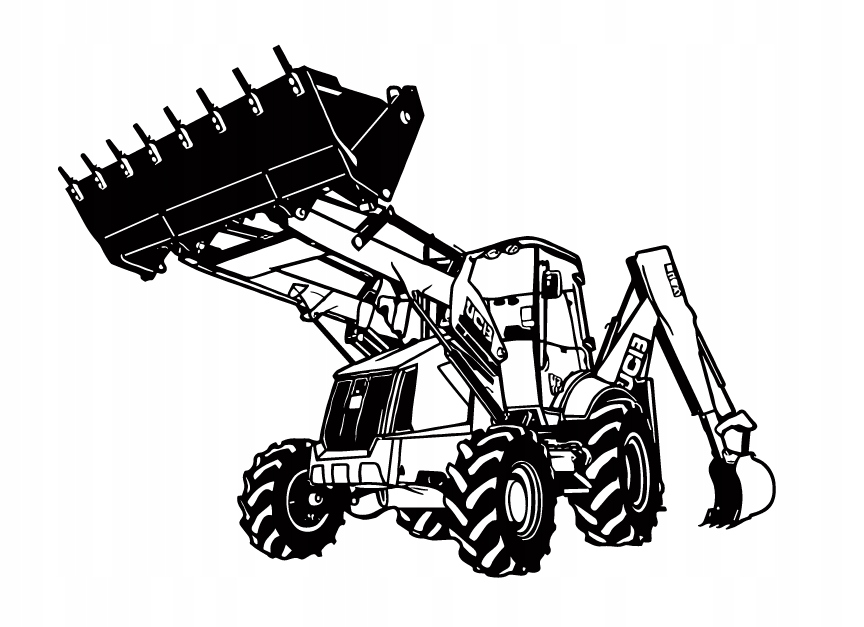 Na ilustracji widoczna jest koparko-ładowarka, przedstawiona w dynamicznej pozycji pracy. Jej przednia część unosi masywną łyżkę na długich ramionach, co podkreśla siłę maszyny i jej zdolność do przenoszenia ciężkich materiałów. Z tyłu znajduje się dodatkowe ramię zakończone mniejszą łyżką, przeznaczoną do precyzyjnych wykopów.