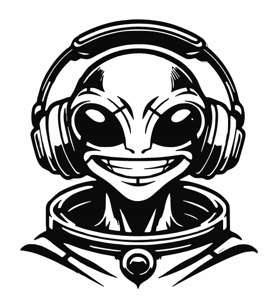 Dekoracja przedstawia uśmiechniętą, przyjazną postać o kosmicznym wyglądzie – istotę z dużymi oczami, w słuchawkach i futurystycznym stroju. Styl graficzny opiera się na mocnym kontraście czerni i bieli, co nadaje całości energii i charakteru. Zastosowane linie są płynne i dynamiczne, dzięki czemu motyw ma nowoczesny, komiksowy wygląd z lekkim humorem.