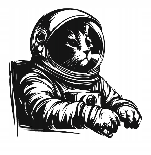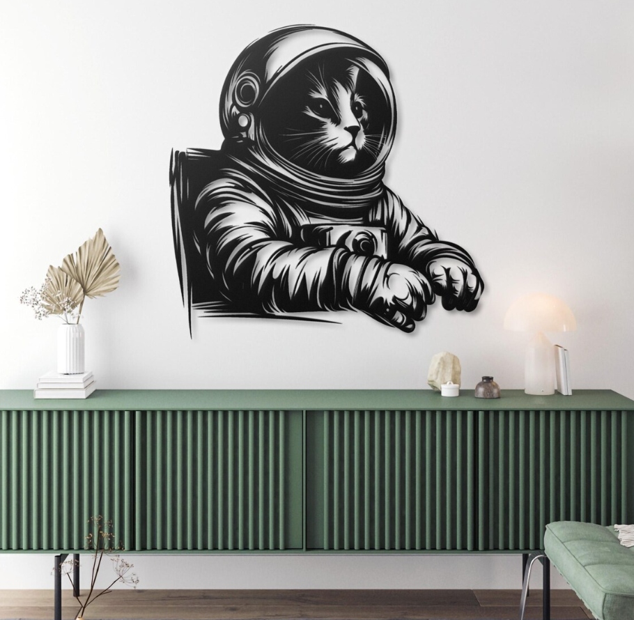 Dekoracja przedstawia kota w skafandrze kosmicznym, co tworzy zabawne i niecodzienne połączenie futrzanego spokoju z atmosferą wielkiej przygody. Wyrazista gra czerni i bieli nadaje ilustracji głębi i kontrastu, podkreślając zarówno miękkość zwierzęcego futra, jak i surowość metalicznego kombinezonu. Kot w roli astronauty symbolizuje ciekawość, niezależność oraz nieustanne dążenie do odkrywania nowych światów.