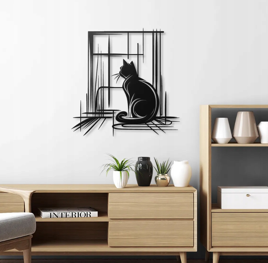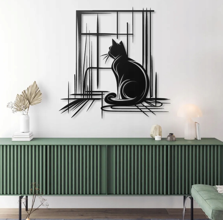 Dekoracja przedstawia kota siedzącego przy oknie, utrzymana w nowoczesnym, linearnym stylu. Smukłe, geometryczne linie tworzą wrażenie lekkości i harmonii, a delikatne kontury zwierzęcia podkreślają jego spokój i skupienie. Całość emanuje ciszą i melancholią chwili, jakby kot zamyślił się, obserwując świat zza szyby.