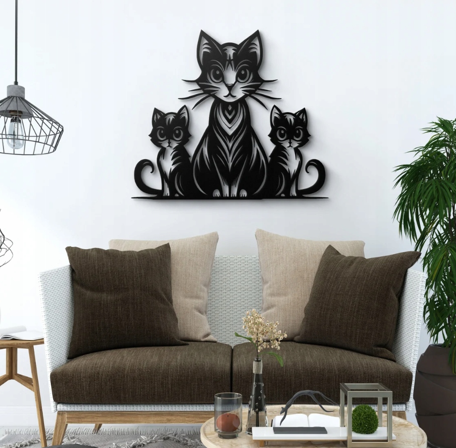 Dekoracja przedstawia dorosłego kota siedzącego między dwoma kociętami, tworząc spójną i harmonijną kompozycję. Symetria układu i wyraziste kontrasty czerni i bieli nadają całości elegancji oraz graficznej lekkości. Duże oczy i delikatne linie futra podkreślają ciepło i urok rodzinnej więzi, a jednocześnie wprowadzają do przestrzeni nutę spokoju i wdzięku.
