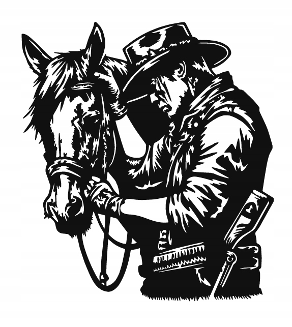 Ta dekoracja przedstawia kowboja stojącego obok swojego konia — pełną emocji i symbolizmu scenę, oddającą ducha Dzikiego Zachodu. Kompozycja emanuje spokojem i wzajemnym zaufaniem między człowiekiem a zwierzęciem, co nadaje jej wyjątkowego ciepła mimo surowego stylu.