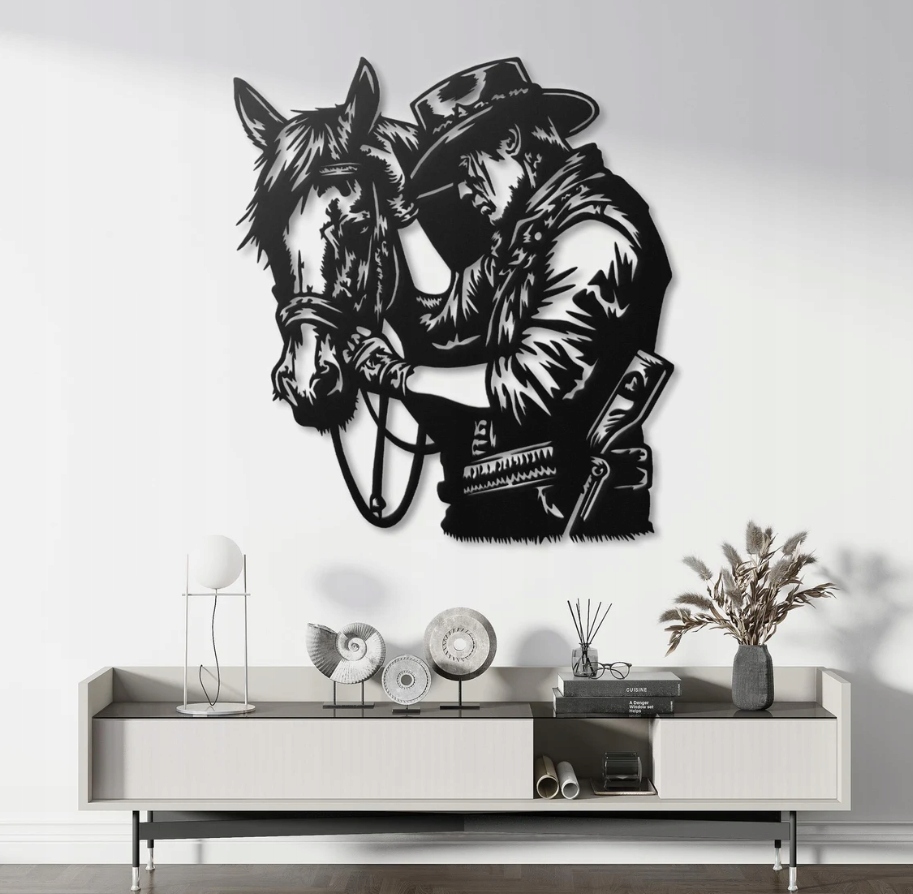 Ta dekoracja przedstawia kowboja stojącego obok swojego konia — pełną emocji i symbolizmu scenę, oddającą ducha Dzikiego Zachodu. Kompozycja emanuje spokojem i wzajemnym zaufaniem między człowiekiem a zwierzęciem, co nadaje jej wyjątkowego ciepła mimo surowego stylu.