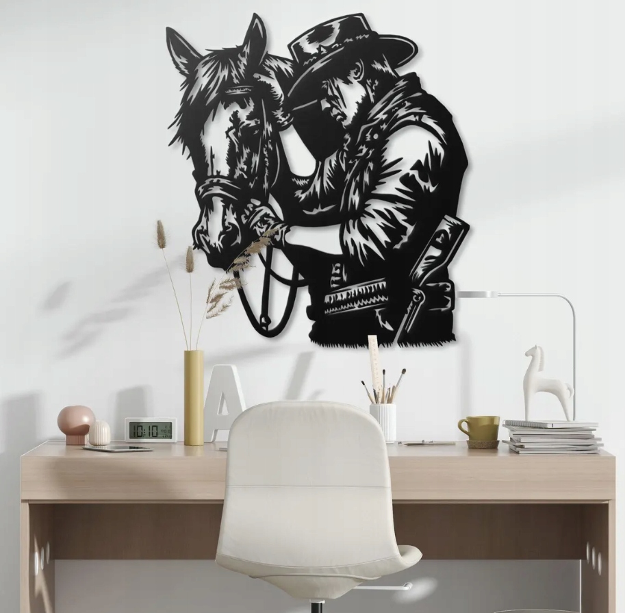 Ta dekoracja przedstawia kowboja stojącego obok swojego konia — pełną emocji i symbolizmu scenę, oddającą ducha Dzikiego Zachodu. Kompozycja emanuje spokojem i wzajemnym zaufaniem między człowiekiem a zwierzęciem, co nadaje jej wyjątkowego ciepła mimo surowego stylu.