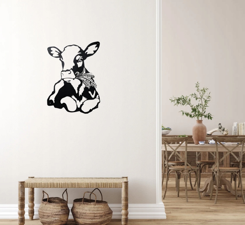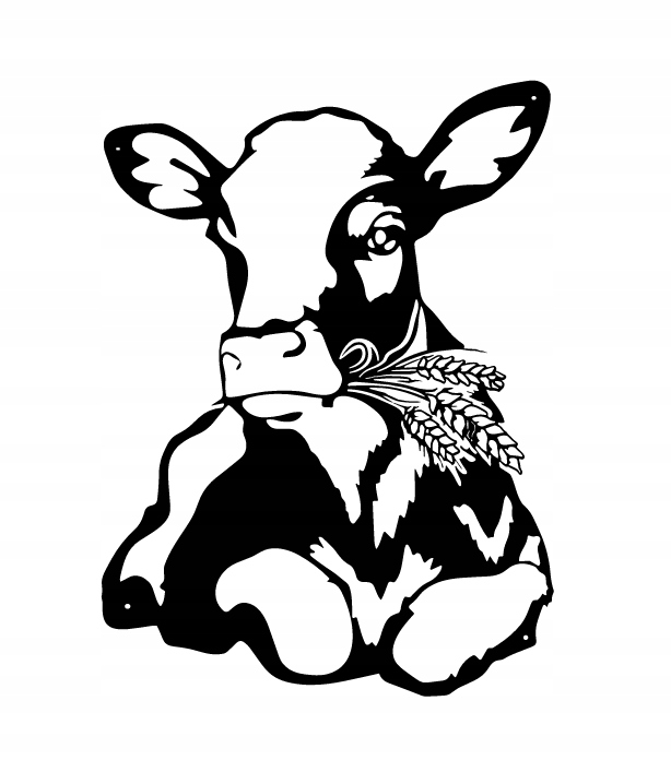 Na ilustracji widzimy krowę w pozycji spoczynkowej, trzymającą w pysku kłos zboża. Kontury są wykonane w kontrastowym, czarno-białym stylu, co podkreśla szczegóły sierści oraz wyraz pyska zwierzęcia. Całość utrzymana jest w uproszczonej, dekoracyjnej formie.