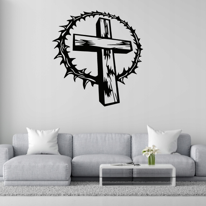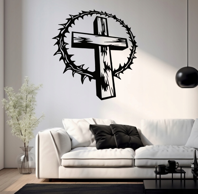 Na ilustracji widzimy krzyż otoczony cierniową koroną. Symbol ten odwołuje się do męki i poświęcenia Jezusa Chrystusa, który według tradycji chrześcijańskiej został ukoronowany cierniem przed ukrzyżowaniem. Krzyż w tym przedstawieniu ma wyraźną, surową fakturę drewna, co dodatkowo podkreśla prostotę, ciężar i realizm cierpienia. Korona cierniowa oplata go ciasno, tworząc mocny wizualny kontrast między ostrymi kolcami a solidnym, prostym kształtem krzyża.