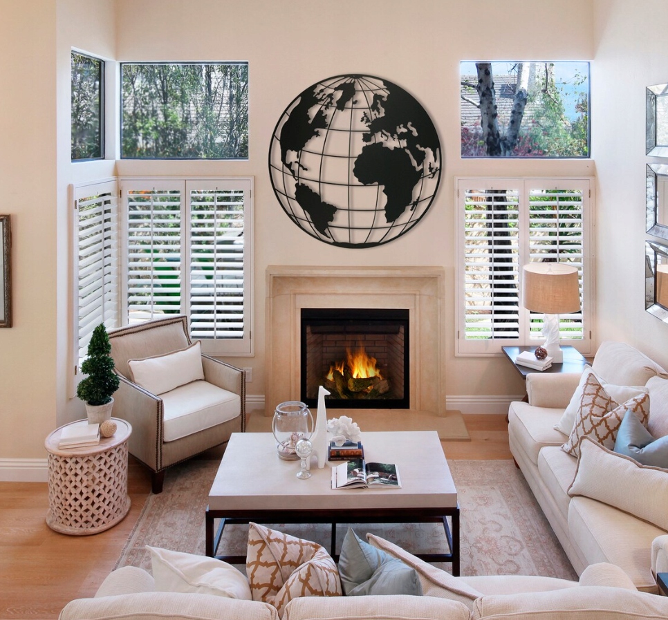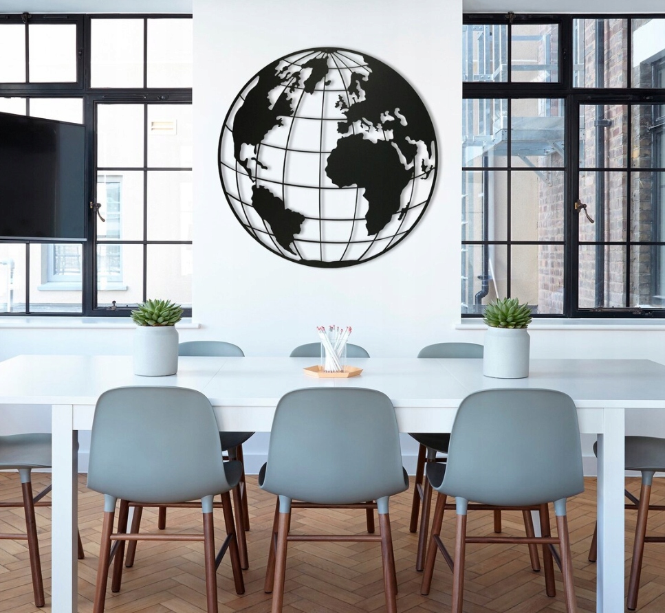 Dekoracja ścienna w formie kuli ziemskiej, przedstawiająca kontynenty w czarno-białym kontrastowym stylu. Geometryczne linie siatki dodają całości elegancji i nowoczesności. Idealny akcent do biura podróży, gabinetu, salonu czy pokoju osoby kochającej odkrywanie świata. Symbolizuje podróże, globalne spojrzenie i otwartość na różnorodność kultur.
